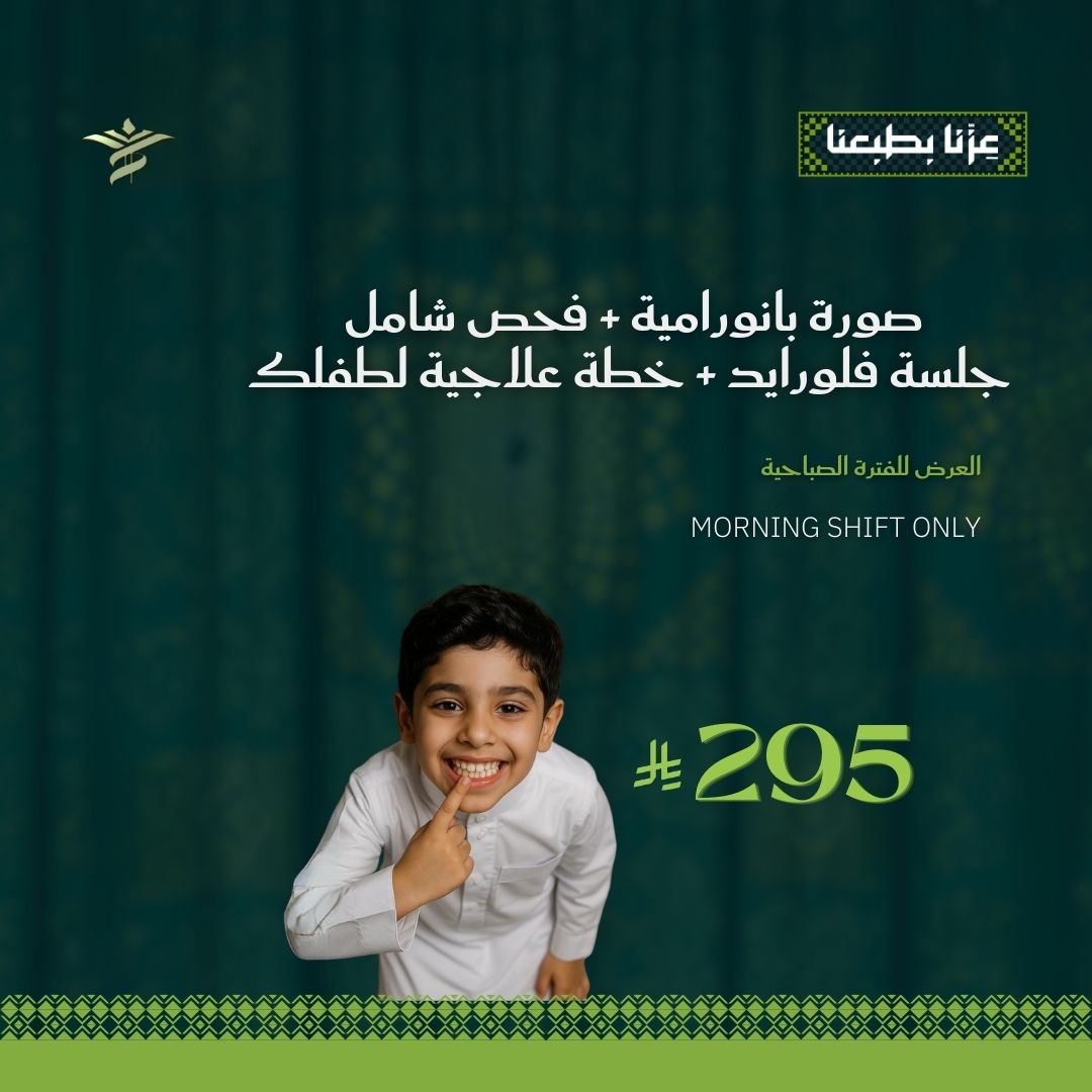 صورة بانورامية + فحص شامل جلسة فلورايد + خطة علاجية لطفلك